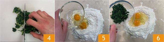 Fein hacken 4. Auf der Arbeitsfläche das Mehl und den Hartweizengrieß zu einem Brunnen formen, dann die Eier 5 und den Mangold 6 in die Mitte geben.