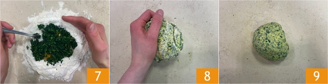 Das Mehl zuerst mit einer Gabel 7, dann mit einem Teigschaber und schließlich mit den Händen 8 zu einem glatten und homogenen Teig vermengen 9. Lassen Sie ihn 30 Minuten bei Raumtemperatur unter einer Schüssel ruhen.