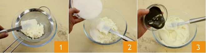 Um die Cannoli aus Filoteig mit Pistazien zuzubereiten, beginnen Sie mit der Füllung: Sieben Sie die Ricotta, die Sie über Nacht im Kühlschrank abtropfen lassen, durch ein feinmaschiges Sieb 1. Wiederholen Sie den Vorgang mindestens zweimal, um die Ricotta cremiger und glatter zu machen (wenn die Ricotta zu fest ist, können Sie sie mit etwas frischer Milch oder Sahne verdünnen), dann fügen Sie den Puderzucker hinzu (Sie können auch Kristallzucker verwenden) 2 und mischen Sie die Zutaten. Geben Sie dann auch die Pistazienpaste hinzu 3.