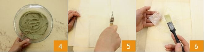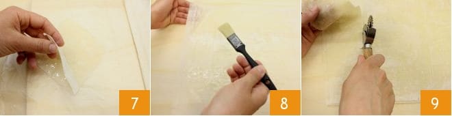 dann legen Sie ein weiteres Blatt darüber 7: Bestreichen Sie auch das zweite Blatt 8 und legen Sie ein drittes darauf. Während Sie diese Schritte ausführen, achten Sie darauf, die anderen unbehandelten Filoteigblätter mit Frischhaltefolie zu bedecken, damit sie beim Kontakt mit der Luft nicht austrocknen. Schneiden Sie mit einem glatten Teigrad Quadrate von etwa 5 cm Seitenlänge aus 9.