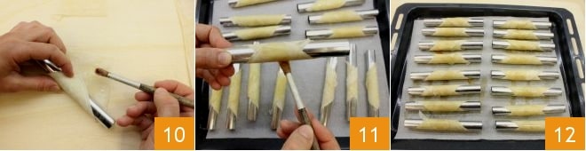 Wickeln Sie jedes Quadrat um ein Cannolo-Rohr, beginnend von einer der Ecken, und befestigen Sie die Spitzen, indem Sie sie mit leicht geschlagenem Eiweiß bestreichen (10-11) (achten Sie darauf, das Cannolo-Rohr nicht zu bestreichen, da Sie sonst die Cannoli nach dem Backen nicht ausformen können). Dann legen Sie die Cannoli auf ein mit Backpapier ausgelegtes Backblech 12 und backen Sie sie in einem vorgeheizten statischen Ofen bei 200° für ca. 8-10 Minuten (180° für 5-6 Minuten, wenn Umluftofen): Filoteig backt sehr schnell.