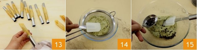Sobald sie goldbraun sind, nehmen Sie sie aus dem Ofen und lassen Sie sie vollständig abkühlen, dann ziehen Sie die Rohre sehr vorsichtig heraus 13. Nehmen Sie die Creme aus dem Kühlschrank und sieben Sie sie mindestens ein paar Mal, um sie glatter und samtiger zu machen 14. Geben Sie die Schokoladentropfen hinzu und vermengen Sie sie mit der Füllung, indem Sie mit einem Spatel umrühren 15.