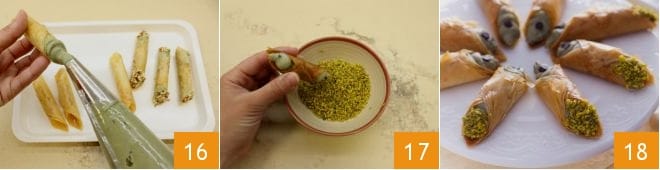 Füllen Sie die Creme in einen Spritzbeutel ohne Tülle oder mit glatter Tülle und füllen Sie jeden Cannolo 16. Als letzten Schliff können Sie eine Seite der Cannoli aus Filoteig in gehackten Pistazien 17 (oder Haselnüssen oder Mandeln, wenn Sie möchten) wälzen. Servieren Sie die Cannoli aus Filoteig mit Pistazien sofort nach dem Füllen 18!