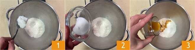 Um den Millefeuille-Cannolo zuzubereiten, beginnen Sie mit der Zubereitung des Teigs: In eine Küchenmaschine geben Sie das Mehl, das Schmalz 1, den Zucker 2 und den trockenen Marsala 3.