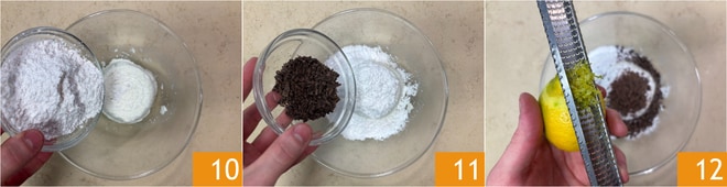 In der Zwischenzeit widmen Sie sich der Füllung: In eine Schüssel geben Sie den Ricotta, dann fügen Sie den Puderzucker 10, die dunklen Schokoladenstückchen 11 und die geriebene Zitronenschale 12 hinzu.