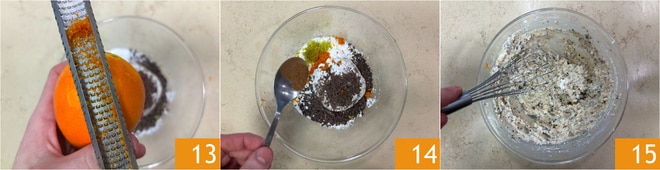 Fügen Sie auch die Orangenschale 13, den Zimt 14 hinzu und mischen Sie 15 gut, bis alle Zutaten vermischt sind. Füllen Sie die Masse in einen Spritzbeutel ohne Tülle und legen Sie ihn beiseite.