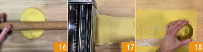 Nehmen Sie den Teig wieder und rollen Sie ihn zunächst mit einem Nudelholz 16 und dann mit einer Nudelmaschine 17 aus, beginnend mit der größten Dicke bis zur kleinsten. Der Teig sollte etwa 2 mm dick sein. Legen Sie ihn auf eine leicht bemehlte Arbeitsfläche und schneiden Sie ihn zur einfacheren Handhabung in der Mitte durch, dann schneiden Sie Scheiben mit einem runden Ausstecher von 9 cm Durchmesser 18. Den restlichen Teig können Sie erneut kneten; lassen Sie ihn immer 30 Minuten im Kühlschrank ruhen, um ihn dann erneut auszurollen und weitere Scheiben zu erstellen. Mit dieser Menge sollten Sie etwa 20 Scheiben erhalten.