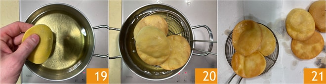 Erhitzen Sie das Pflanzenöl auf eine Temperatur von 160°-170°, dann tauchen Sie 2-3 Scheiben gleichzeitig ein 19. Nach ein paar Minuten beginnen sie auf einer Seite goldbraun zu werden, dann drehen Sie sie um und frittieren sie weitere 2 Minuten. Abtropfen lassen 20 und auf Küchenpapier legen, um überschüssiges Öl zu entfernen 21.
