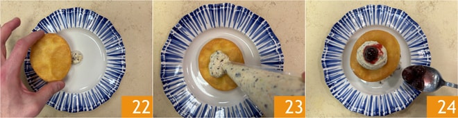 Sie sind bereit zum Anrichten: Drücken Sie einen Klecks Creme in die Mitte des Tellers und legen Sie dann eine Waffel darauf 22. Füllen Sie die Waffel mit der Creme 23 und wiederholen Sie diesen Vorgang, bis Sie insgesamt 3 Waffeln haben. Geben Sie auch einen Klecks Creme oben drauf und garnieren Sie mit den kandierten Sauerkirschen 24.