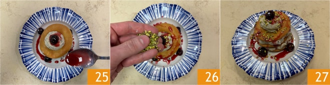 Begießen Sie mit dem Sirup der Sauerkirschen 25 und vervollständigen Sie mit gehackten Pistazien 26. Verfahren Sie genauso, um die anderen 5 Türmchen herzustellen. Ihr Millefeuille-Cannolo ist bereit, serviert zu werden 27!