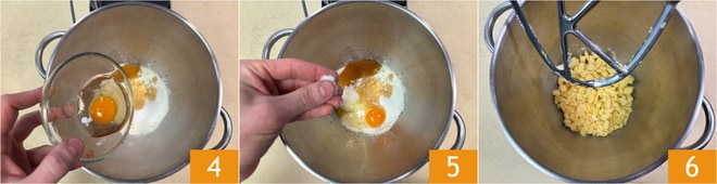 Fügen Sie ein Ei 4, eine Prise Salz 5 hinzu und schalten Sie die Maschine ein, ausgestattet mit einem Flachrührer, bis Sie einen körnigen Teig erhalten 6.
