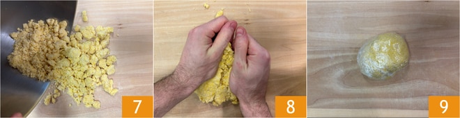 Wechseln Sie auf die Arbeitsfläche 7 und kneten Sie mit den Händen 8, bis Sie einen glatten und homogenen Teig erhalten. Decken Sie ihn mit Frischhaltefolie ab 9 und lassen Sie ihn für 30 Minuten im Kühlschrank ruhen.