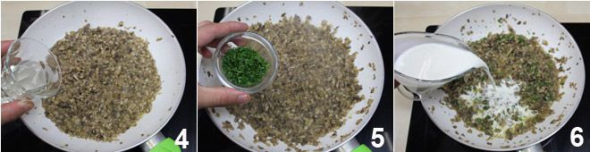 Löschen Sie mit dem Weißwein ab 4, fügen Sie eine Prise Petersilie hinzu 5 und geben Sie die Sahne dazu 6. Lassen Sie es kochen, bis es eine cremige Konsistenz erreicht hat.