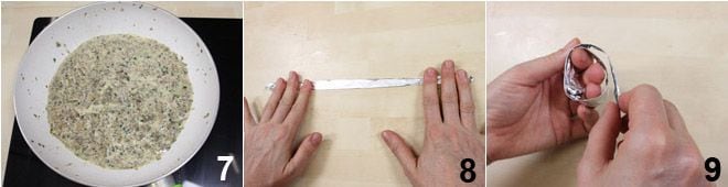 Die Füllung der Jakobsmuscheln mit Wein sollte nicht zu trocken sein 7. Schmecken Sie sie mit Salz und Pfeffer ab, wenn nötig. Nehmen Sie jetzt ein Backblech und bedecken Sie es mit Backpapier. Bilden Sie mit Alufolienstreifen Kreise (8-9), die als Stütze für die Jakobsmuscheln mit Wein an der Basis jeder Schale dienen.