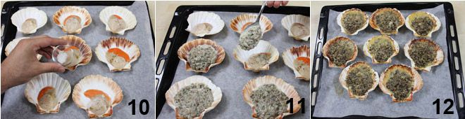 Platzieren Sie die Jakobsmuscheln auf ihren Stützen, salzen und pfeffern Sie sie leicht, um sie zu würzen 10. Geben Sie dann die zuvor zubereitete Füllung auf die Jakobsmuscheln 11 und backen Sie sie 20 Minuten lang bei 200 °C im statischen Ofen. Schalten Sie in den letzten 5 Minuten den Grill ein, um eine schöne Gratinschicht zu erhalten. Die Tapa Jakobsmuscheln mit Wein ist bereit zum Genießen!