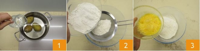 Um die Cappellacci mit Cotechino und Linsencreme zuzubereiten, setzen Sie als erstes die Kartoffeln zum Kochen auf, die für die Füllung benötigt werden 1. Je nach ihrer Größe dauert dies etwa 30-50 Minuten. Bereiten Sie dann die Eiernudeln zu: sieben Sie das Mehl in eine Schüssel 2, fügen Sie die zuvor geschlagenen Eier hinzu 3