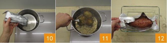 In der Zwischenzeit kochen Sie auch das Cotechino, indem Sie den Anweisungen auf der Packung folgen. In unserem Fall wurde es in kaltem Wasser eingelegt und etwa 30 Minuten lang gekocht 10. Zu diesem Zeitpunkt sind auch die Kartoffeln gar. Um die Garzeit zu überprüfen, stechen Sie mit den Zinken einer Gabel hinein 11; wenn diese leicht eindringen, sind sie gar. Lassen Sie sie abtropfen und stellen Sie sie beiseite. Wenn das Cotechino fertig ist, nehmen Sie es aus dem Wasser und schälen Sie es 12, achten Sie darauf, sich nicht mit der im Behälter enthaltenen Flüssigkeit zu verbrühen.