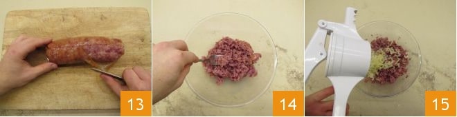 Legen Sie das Cotechino auf ein Schneidebrett und entfernen Sie die Haut 13, dann geben Sie es zurück in eine Schüssel und zerdrücken es mit einer Gabel 14. Zerdrücken Sie in derselben Schüssel auch die Kartoffeln 15,