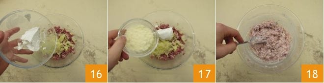 fügen Sie den Ricotta 16, den Parmesan 17 und den Pfeffer hinzu. Mischen Sie alles, bis die Zutaten gleichmäßig verteilt sind 18 und stellen Sie sie in den Kühlschrank.