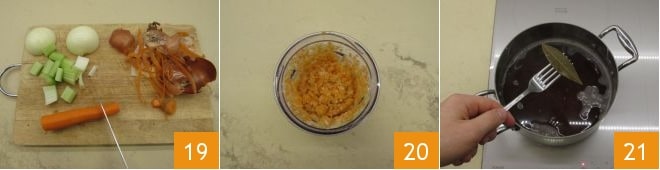 Kümmern Sie sich um die Linsen. Säubern Sie Möhre, Zwiebel und Sellerie 19, hacken Sie sie fein mit einem Messer oder verwenden Sie einen Mixer 20. Sobald die Linsen gar sind, entfernen Sie das Lorbeerblatt 21.