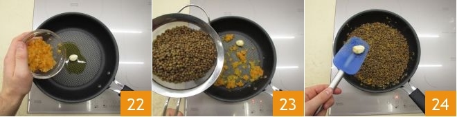 Lassen Sie sie abtropfen und bewahren Sie das Kochwasser auf. Geben Sie etwas Öl in eine Pfanne, fügen Sie eine Knoblauchzehe und die gehackte Mischung hinzu 22. Lassen Sie es bei mittlerer Hitze aromatisieren und fügen Sie die Linsen hinzu 23. Braten Sie alles ein paar Minuten an und entfernen Sie dann die Knoblauchzehe 24.