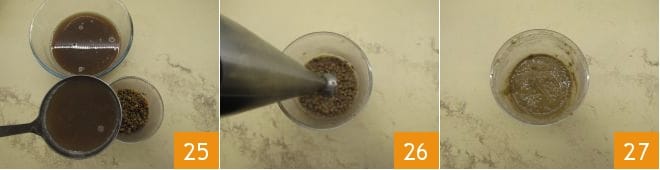 Geben Sie sie in das Glas eines Mixers und pürieren Sie sie mit einem Stabmixer 26, indem Sie etwas Kochwasser hinzufügen 25, bis Sie eine glatte Creme erhalten 27.