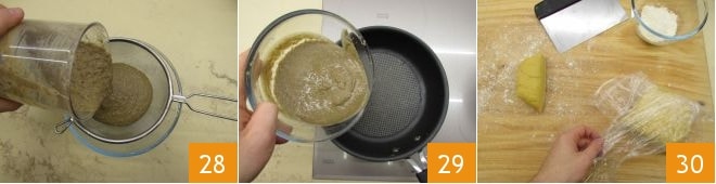 Um eine noch samtigere Creme zu erhalten, sieben Sie sie 28; geben Sie sie dann in einen kleinen Topf 29, damit Sie sie erwärmen können, während Sie die Pasta anbraten. Jetzt, wo alles bereit ist, kümmern Sie sich um die Pasta. Nehmen Sie ein Stück Teig, den Rest decken Sie erneut mit der Frischhaltefolie ab 30, und bestäuben Sie es leicht mit Hartweizengrießmehl.
