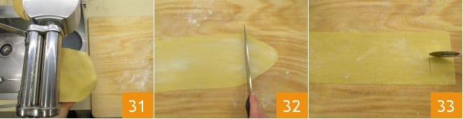 Verwenden Sie eine Nudelmaschine oder ein Nudelholz auf einer Arbeitsfläche, um einen sehr dünnen Teig auszurollen 31. Bei der Nudelmaschine beginnen Sie mit der größten Zahl und gehen dann zur kleinsten über. Nur bei Bedarf können Sie etwas Hartweizengrießmehl hinzufügen. Entfernen Sie die Ränder, wenn sie zu grob sind 32, und schneiden Sie dann Quadrate von 7-8 cm 33.