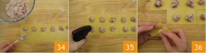 Geben Sie in die Mitte jedes Quadrats etwa einen halben Teelöffel Füllung 34 und befeuchten Sie dann nur zwei Seiten mit etwas Wasser. Verwenden Sie dabei gerne eine Sprühflasche 35 oder einen Pinsel. Nun schließen Sie die Quadrate und formen die Cappellacci. Bringen Sie zwei gegenüberliegende Spitzen zusammen, um ein Dreieck zu formen 36.