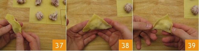 Drücken Sie dann mit den Fingern alle Ränder zusammen 37, um sie vollständig zu schließen und die Luft herauszudrücken. Drücken Sie die Enden des Dreiecks direkt auf die Arbeitsfläche, schieben Sie den Mittelteil nach oben mit den Daumenspitzen und verbinden Sie schließlich die beiden Enden, indem Sie sie nach unten ziehen, in die entgegengesetzte Richtung zur Spitze 39.