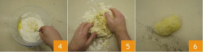 und beginnen Sie mit einer Gabel zu mischen 4, um die Zutaten zu vermengen. Übertragen Sie die Mischung dann auf eine Arbeitsfläche 5 und kneten Sie sie mit den Händen, bis Sie eine homogene Masse erhalten 6.