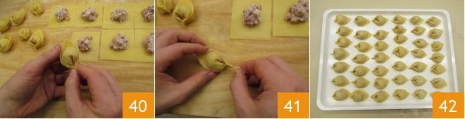 Drücken Sie mit den Fingern zusammen, um zu versiegeln 40, und falls nötig, können Sie ein Stück Teig entfernen, das sonst zu dick wäre 41. Wenn Sie die Cappellacci formen (mit dieser Menge erhalten Sie etwa 60), legen Sie sie auf ein leicht mit Hartweizengrießmehl bestäubtes Tablett. Sobald alle fertig sind 42, setzen Sie einen Topf mit gesalzenem Wasser auf den Herd; er wird zum Kochen benötigt.