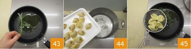 In der Zwischenzeit geben Sie etwas Öl in eine Pfanne und aromatisieren Sie es mit einem Rosmarinzweig und ein paar Salbeiblättern. Sobald das Wasser zu kochen beginnt, geben Sie die Cappellacci in den Topf und kochen Sie sie 2 bis 4 Minuten lang, je nachdem, wie lange Sie sie an der Luft trocknen gelassen haben. Wenn die Cappellacci gar sind, lassen Sie sie direkt in der Öl-, Rosmarin- und Salbeimischung abtropfen; bräunen Sie sie kurz an.