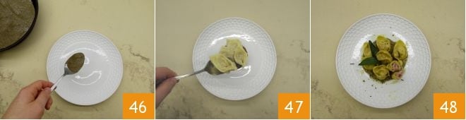 Geben Sie dann etwas Linsencreme auf einen Teller 46 und legen Sie die Cappellacci in die Mitte 47. Garnieren Sie mit etwas Salbei, Rosmarinnadeln und einer Prise Pfeffer 48. Ihre Cappellacci mit Cotechino und Linsencreme sind bereit!
