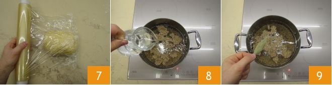 Wickeln Sie die Eiernudeln in Frischhaltefolie und lassen Sie sie bei Raumtemperatur ruhen 7. In der Zwischenzeit kümmern Sie sich auch um das Kochen der Linsen: spülen Sie sie ab und geben Sie sie in einen Topf. Bedecken Sie sie mit Wasser 8, fügen Sie das Lorbeerblatt hinzu 9 und lassen Sie sie etwa 30 Minuten kochen.