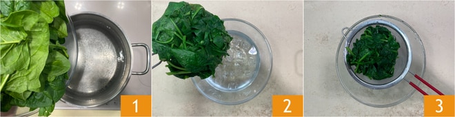 Um die Cappellacci mit Garnelen und Artischocken zuzubereiten, kümmern Sie sich zuerst um die frische Eierpasta mit Spinat: Blanchieren Sie sie in kochendem Salzwasser 1, bis sie weich sind. Lassen Sie sie abtropfen und geben Sie sie in eine Schüssel mit Eiswasser, um die grüne Farbe lebendig zu halten 2. Drücken Sie sie in einem Sieb aus 3.