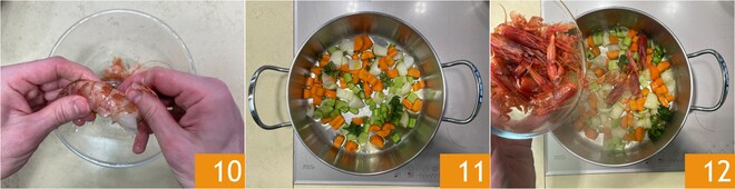 Reinigen Sie die Garnelen und bewahren Sie die Schalen auf 10. In einem Topf erhitzen Sie etwas Öl und fügen grob gehackte Karotten, Zwiebeln und Sellerie hinzu 11. Fügen Sie die Schalen der Garnelen hinzu 12.
