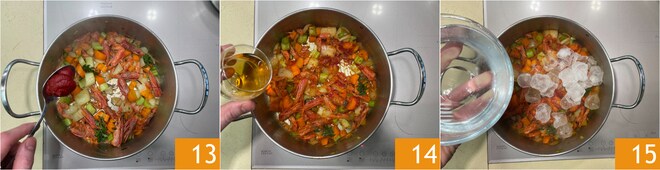 Fügen Sie den Majoran und einen Esslöffel Tomatenmark hinzu 13. Rösten Sie alles, dann löschen Sie es mit Cognac ab 14 und, wenn Sie möchten, können Sie es vorsichtig flambieren. Bedecken Sie es mit kaltem Wasser und Eis 15.