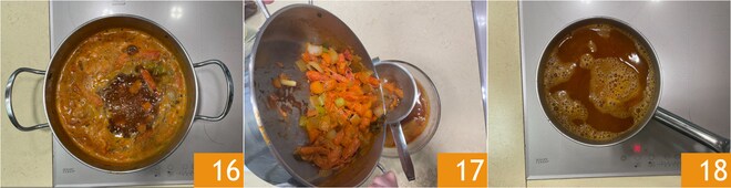 Kochen Sie den Fond 25 Minuten bei geringer Hitze 16. Dann filtern Sie ihn durch ein Sieb 17 und stellen ihn wieder auf niedrige Hitze 18, bis er reduziert ist, das dauert mindestens 20 Minuten.
