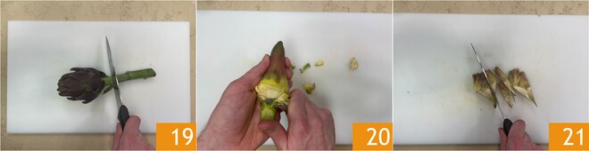 Jetzt reinigen Sie die Artischocken: Trennen Sie den Stiel 19, entfernen Sie die äußeren, harten Blätter und schälen Sie die äußere harte Schale mit einem kleinen Messer 20. Schneiden Sie die Herzen in Keile 21 und entfernen Sie das innere Stroh.