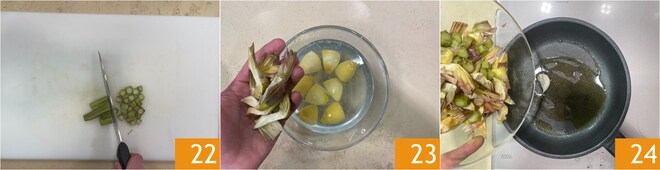 Schälen Sie auch den Stiel und schneiden Sie ihn in Stücke 22. Bewahren Sie die gereinigten Artischocken in Wasser mit Zitrone auf, damit sie nicht braun werden 23. In einer Pfanne erhitzen Sie etwas Öl mit einer zerdrückten Knoblauchzehe, geben Sie die Artischocken hinzu 24.