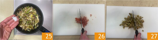 Fügen Sie Salz 25 und weißen Pfeffer hinzu, dann lassen Sie sie etwa zehn Minuten sautieren, um sie weich zu machen, fügen Sie bei Bedarf einen Schuss Wasser hinzu. Hacken Sie die gereinigten Garnelen 26 und die gekochten Artischocken 27.