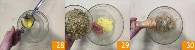 Mit dem Kartoffelstampfer zerdrücken Sie die zuvor gekochte Kartoffel zu einem Püree 28, fügen Sie die Garnelen und Artischocken hinzu 29, Salz, weißen Pfeffer 30 und einen Schuss Öl, dann mischen Sie, um alles zu vermengen.