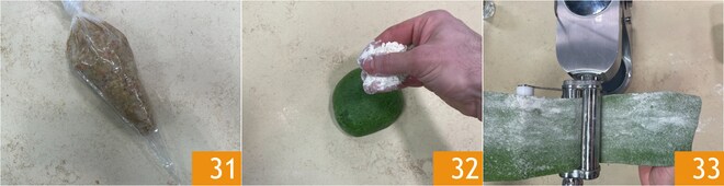 Geben Sie die Füllung in einen Spritzbeutel 31. Nehmen Sie den Teig, mehlen Sie ihn leicht 32 und geben Sie ihn in die Nudelmaschine 33, beginnend mit der größten Dicke bis zu einer Dicke von etwa 2-3 mm.