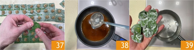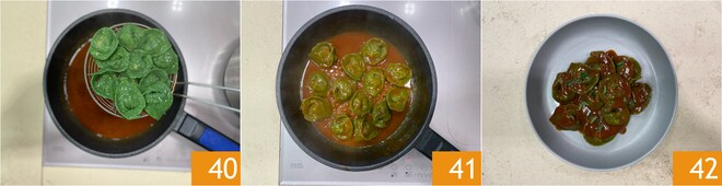 Falten Sie die beiden Enden zur Mitte und verbinden Sie die beiden Enden 37. In der Zwischenzeit bringen Sie Wasser für die Pasta zum Kochen. Geben Sie den reduzierten Fond in eine breite Pfanne mit einer Kelle des Kochwassers der Cappellacci. Kochen Sie die Cappellacci, bis sie an die Oberfläche steigen 39, das dauert nur wenige Minuten.