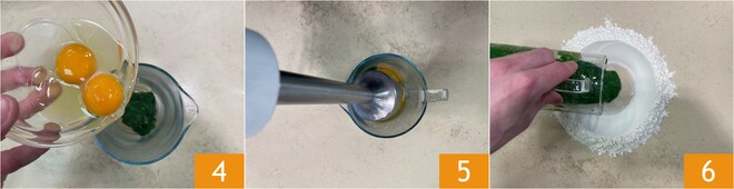 Geben Sie den Spinat in einen Krug, fügen Sie die Eier 4, Salz und einen Schuss Öl hinzu. Mixen Sie mit dem Stabmixer 5, um eine Creme zu erhalten. Sieben Sie das Mehl auf die Arbeitsfläche und geben Sie die Spinatcreme in die Mitte 6.