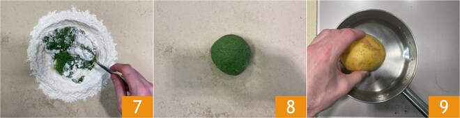 Vermischen Sie zuerst mit der Gabel 7 und dann von Hand, bis Sie einen glatten und kompakten Teig erhalten 8. Decken Sie ihn mit Frischhaltefolie ab und lassen Sie ihn 30 Minuten im Kühlschrank ruhen. In der Zwischenzeit kümmern Sie sich um die Füllung: Kochen Sie die Kartoffel 9, bis sie weich ist.