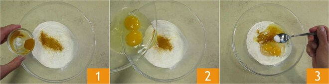 Um die Kurkuma-Cappellacci mit Butter und Grana Padano zuzubereiten, beginnen Sie mit der frischen Pasta: Geben Sie das Mehl in eine große Schüssel, aromatisieren Sie mit dem Kurkuma 1, fügen Sie die Eier 2 und das Salz 3 hinzu.