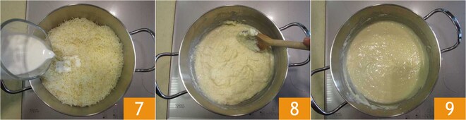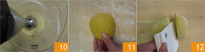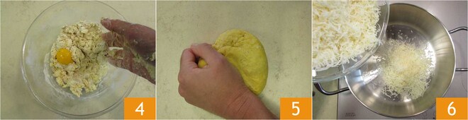 Arbeiten Sie die Zutaten zunächst von Hand in der Schüssel 4, dann, wenn sie gut vermischt sind, gehen Sie auf die Arbeitsfläche und kneten Sie weiter, bis Sie einen glatten und homogenen, gut festen Teig erhalten 5. Lassen Sie ihn 30 Minuten bei Raumtemperatur in Frischhaltefolie eingewickelt ruhen. In der Zwischenzeit bereiten Sie die Füllung vor: Geben Sie den geriebenen Grana Padano DOP Riserva in einen Topf 6.