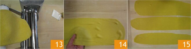 Rollen Sie den Teig sehr dünn mit der Nudelmaschine aus, indem Sie die frische Pasta mindestens zweimal durch die Walze führen, bis zum vorletzten Schritt der Maschine, um eine Dicke von etwa einem halben Zentimeter zu erreichen 13. So verfahren Sie mit jedem der Stücke frischer Pasta 14 15.